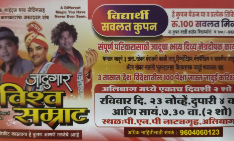 अलिबाग : अलिबागकरांसाठी मनोरंजनाची पर्वणी ठरणारा भव्य आणि आधुनिक जादू शो धनराज थिएटर प्रस्तुत जादूगार ‘विश्व सम्राट’ यांच्या सादरीकरणासह अलिबागमध्ये २३ नोव्हेंबर रोजी आयोजित करण्यात आला आहे. या कार्यक्रमात तब्बल दहा कलाकारांचा भव्य संच सहभागी असून संपूर्ण शो लाईट इफेक्ट्स, अॅक्शन, थ्रिल आणि हास्याने भरलेला असणार आहे.
