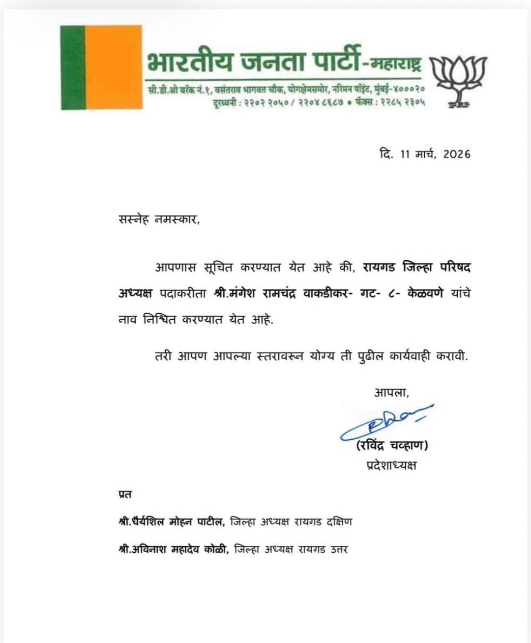 रायगड जिल्हा परिषदेत गेल्या काही दिवसांपासून सुरू असलेला सत्तेचा तिढा अखेर सुटला आहे. रायगड जिल्हा परिषदेच्या अध्यक्षपदी भाजपचे नवनिर्वाचित सदस्य मंगेश वाकडीकर यांच्या नावावर शिक्कामोर्तब करण्यात आले आहे. याबाबतची अधिकृत घोषणा भाजपचे प्रदेशाध्यक्ष रवींद्र चव्हाण यांनी केली असून सत्यमेव जयते न्यूज डॉट कॉमच्या हाती संबंधित नियुक्तीपत्र लागले आहे.