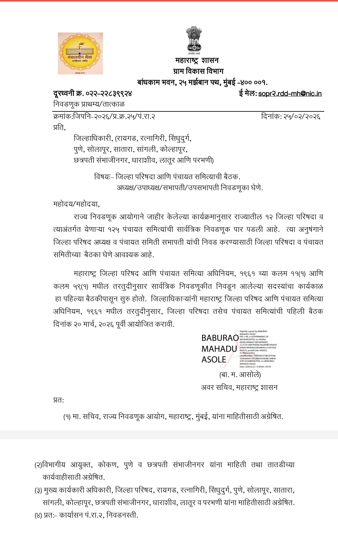 या पत्रावर ग्रामविकास विभागाचे अवर सचिव बाबुराव महादू आसोले यांची स्वाक्षरी असून संबंधित जिल्हाधिकाऱ्यांना तातडीने आवश्यक कार्यवाही करण्यास सांगण्यात आले आहे.