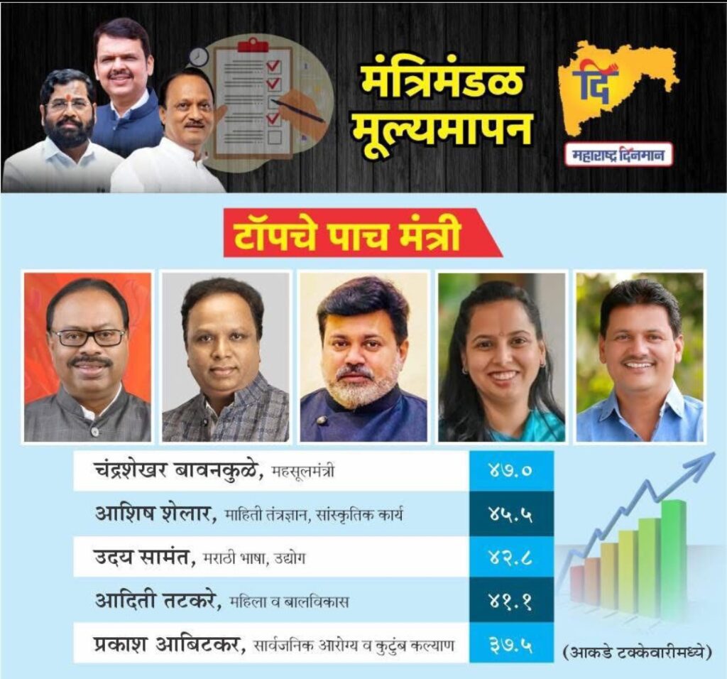 या मूल्यमापनात महसूल मंत्री चंद्रशेखर बावनकुळे, सांस्कृतिक कार्य व माहिती तंत्रज्ञान मंत्री आशिष शेलार आणि उद्योग व मराठी भाषा मंत्री उदय सामंत यांच्या कामगिरीचे विशेष कौतुक करण्यात आले आहे. प्रशासनातील निर्णयप्रक्रिया, कामाचा वेग आणि खात्यांवरील नियंत्रण या निकषांवर हे मंत्री सरस ठरल्याचे पत्रकारांचे मत आहे. त्यांच्यासोबत महिला व बालविकास मंत्री आदिती तटकरे आणि सार्वजनिक आरोग्यमंत्री प्रकाश आबिटकर यांनीही चांगले गुण मिळवत कामगिरीत आघाडी घेतली आहे.