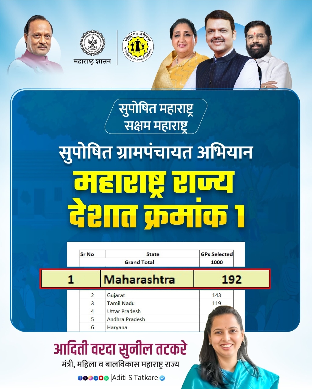 सुपोषण ही केवळ एखाद्या स्पर्धेतील यशाची नोंद नसून राज्याच्या भविष्यातील पिढी घडवण्याचा मूलभूत पाया आहे. निरोगी बालक, सक्षम माता आणि जागरूक कुटुंब व्यवस्था यावरच सशक्त महाराष्ट्राची उभारणी अवलंबून असते. याच व्यापक दृष्टीकोनातून महाराष्ट्राने भारत सरकारच्या “सुपोषित ग्रामपंचायत अभियान” अंतर्गत देशात पहिला क्रमांक पटकावत राष्ट्रीय पातळीवर आपली ठसठशीत छाप उमटवली आहे. मुख्यमंत्री देवेंद्र फडणवीस, उपमुख्यमंत्री एकनाथ शिंदे आणि उपमुख्यमंत्री अजित पवार यांच्या नेतृत्वाखाली राज्याने ग्रामीण पोषण व्यवस्थेत सातत्यपूर्ण आणि परिणामकारक कामगिरी करत ही ऐतिहासिक झेप घेतली असल्याची माहिती मंत्री अदिती तटकरे यांनी दिली.